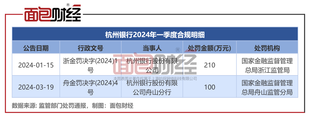 需注意的是,2024年第一季度,杭州银行收到单张处罚金额210万元的大额罚单。