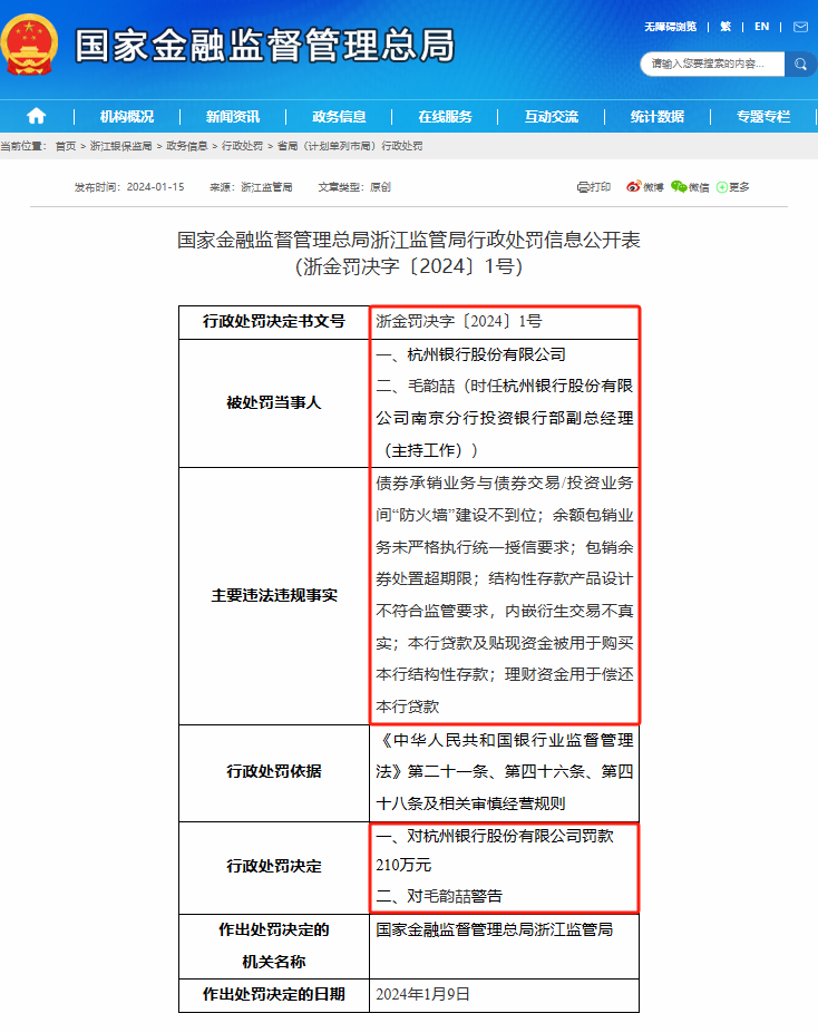 2024年1月15日,杭州银行被国家金融监督管理总局浙江监管局处以罚款210万元。主要违法违规事实为:“债券承销业务与债券交易/投资业务间“防火墙”建设不到位;余额包销业务未严格执行统一授信要求;包销余券处置超期限;结构性存款产品设计不符合监管要求,内嵌衍生交易不真实;本行贷款及贴现资金被用于购买本行结构性存款;理财资金用于偿还本行贷款”。时任杭州银行南京分行投资银行部副总经理毛韵喆被处以警告。