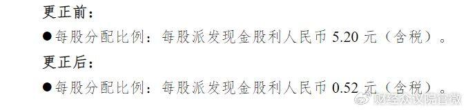 杭州银行发布的《2023年度利润分配方案公告》,在该公告中的“重要内容提示”中的“每股分配比例”列示,每股派发现金股利人民币 5.20 元(含税)。但实际上应为“每股派发现金股利人民币 0.52 元(含税)”,整整“缩水”了10倍。