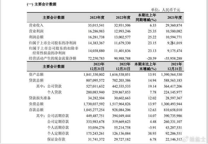 2023年,杭州银行实现归母净利润143.83亿元,同比增长23.15%;基本每股收益2.31元,同比增长26.23%;加权平均净资产收益率15.57%,同比提高1.48 个百分点。