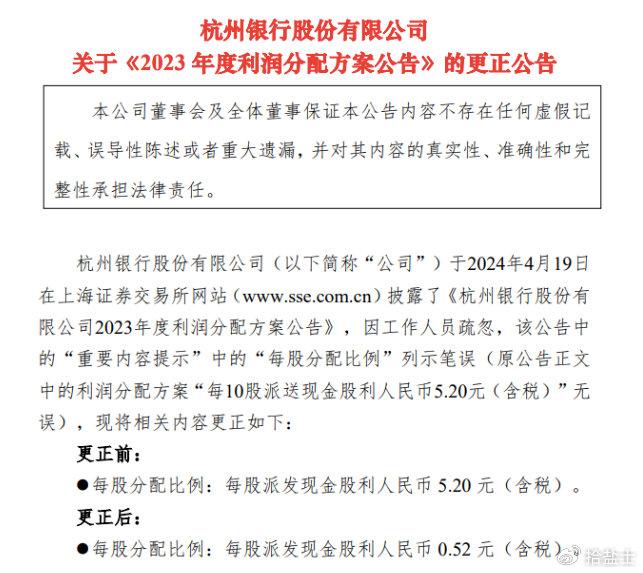 近日,杭州银行在披露2023年度利润分配方案公告时,就将原本为“2023年度拟每10股派息5.20元”的分红政策误写为“2023年度拟每股派息5.20元”,相差整整十倍。