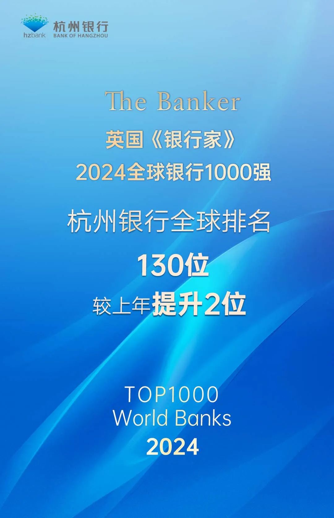 近日,英国《银行家》杂志(The Banker)发布“2024年全球银行1000强”榜单,按照一级资本排名,杭州银行位居全球第130位,较上年稳步上升2位。