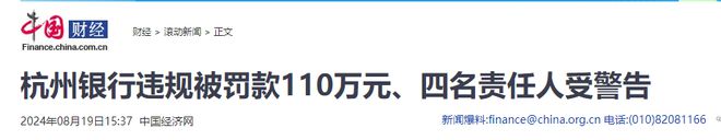 8月15日,国家金融监管总局浙江监管局披露的行政处罚信息显示,因三项违法违规行为,杭州银行被罚款110万元。