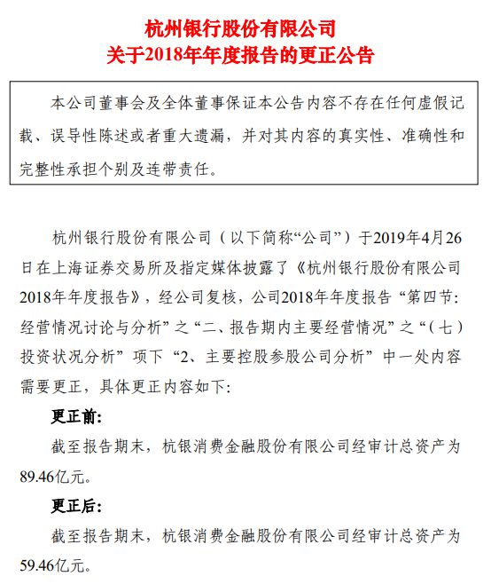 例如2019年5月,杭州银行发布《关于2018年年度报告的更正公告》,公告显示,该行年报中有一处将杭银消金总资产写错,将59.46亿元写成了89.46亿元。