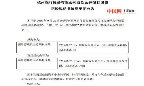 还有2016年9月,杭州银行公告的《杭州银行股份有限公司首次公开发行股票招股说明书》摘要中,把募资额的“亿”写成了“万”,37.67亿元写成37.67万元。