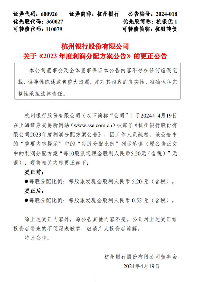 但很快,杭州银行又发布《关于的更正公告》,称因工作人员疏忽,该公告的重要内容提示中的“每股分配比例”存在笔误,更正后: