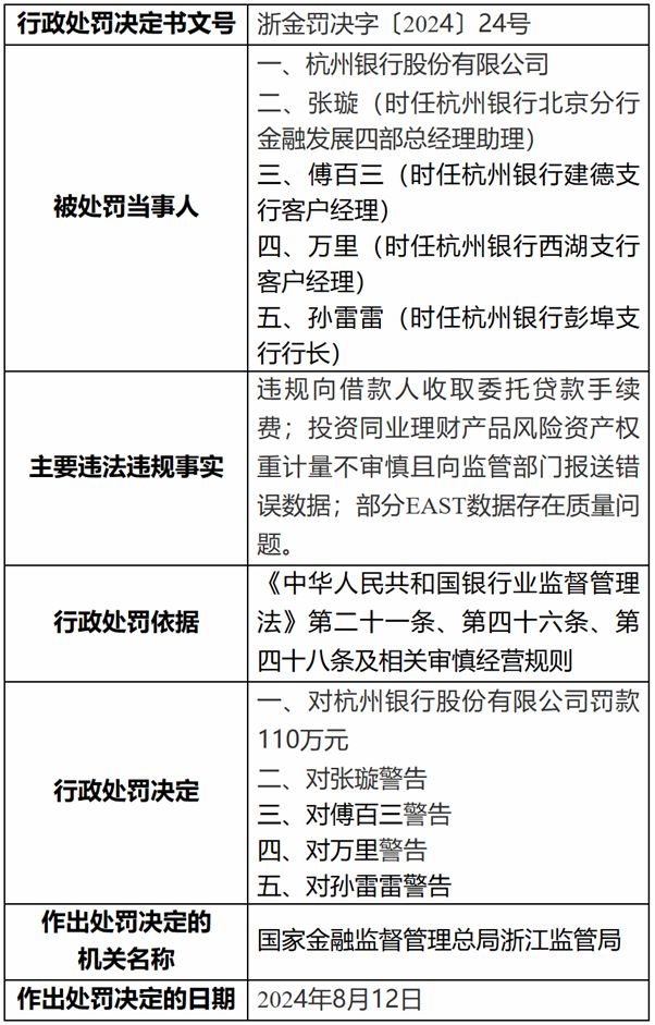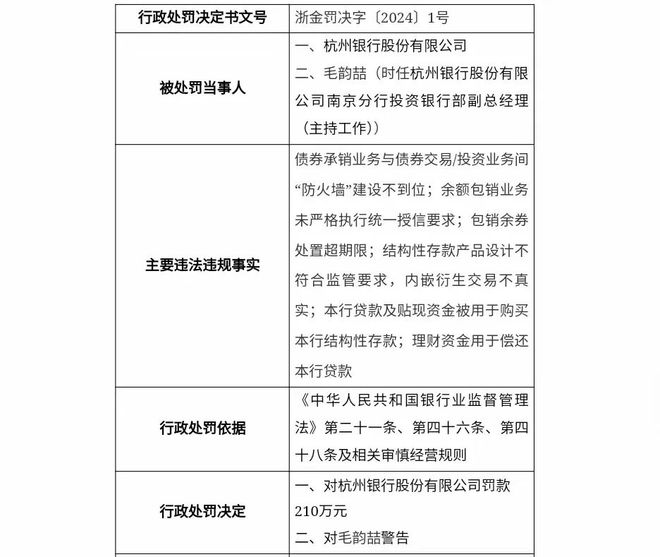 2024年1月,杭州银行收到金融监管总局浙江监管局1号罚单,被罚款210万元,时任南京分行投资银行部副总经理被警告处罚。
