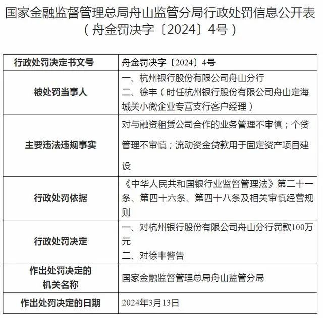 2024年3月,该行舟山分行对与融资租赁公司合作的业务管理不审慎等3项主要违法违规行为,被罚款100万元,时任舟山定海城关小微企业专营支行客户经理被处以警告处罚。