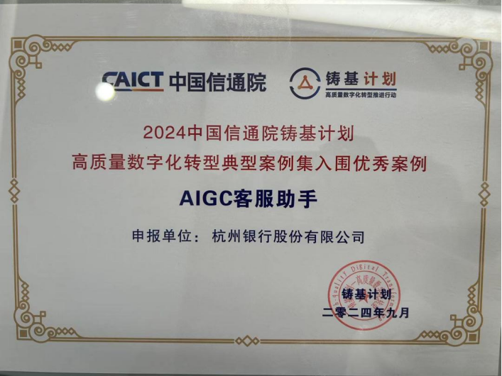 近日,由中国互联网协会中小企业发展工作委员会主办的“2024大模型数字生态发展大会暨铸基计划年中会议”在北京成功召开,我行“AIGC客服助手”项目荣获“高质量数字化转型典型案例集入围优秀案例”。
