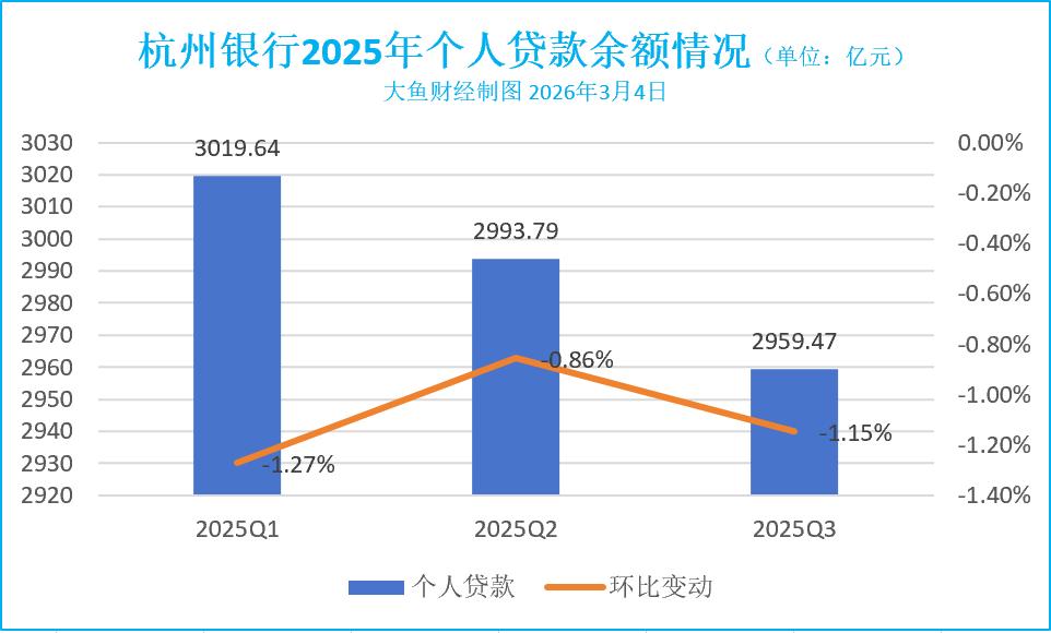 去年,杭州银行个人贷款余额持续收缩,个人贷款余额在2025年连续三个季度下降,2025年9月末,个人贷款余额为2959.47亿元,环比下降1.15%,在总贷款余额中占比为28.86%。