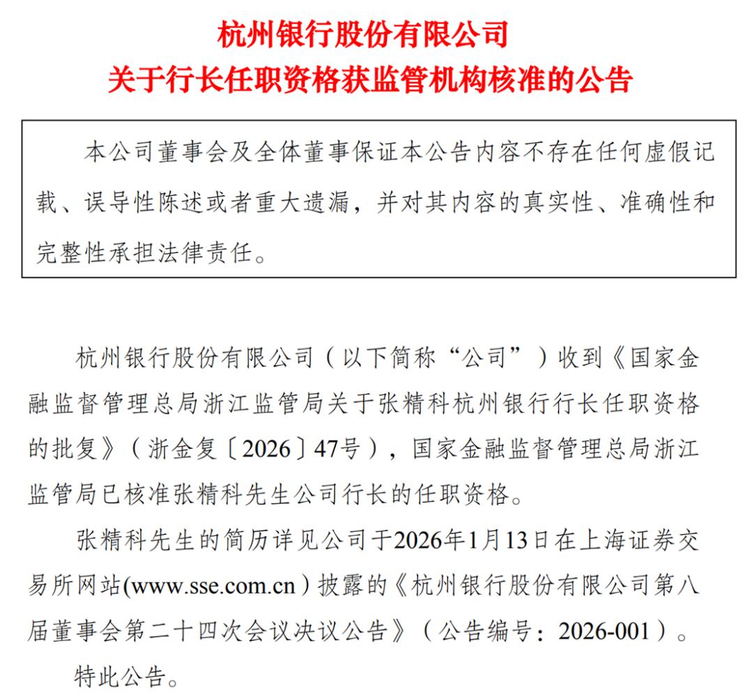 3月2日,杭州银行发布公告称,该行收到国家金融监督管理总局浙江监管局批复,张精科任该行行长的任职资格已获得核准。