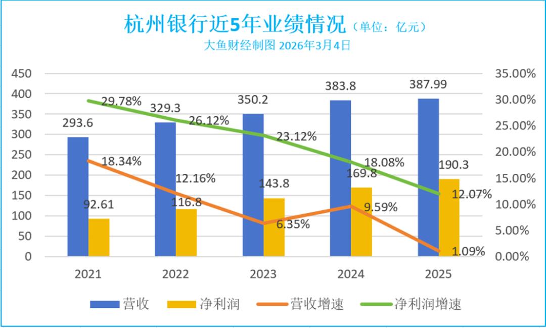 2025年业绩快报显示,该杭州银行全年实现营业收入387.99亿元,同比增长1.09%;归属于上市公司股东的净利润为190.30亿元,同比增长12.05%。
