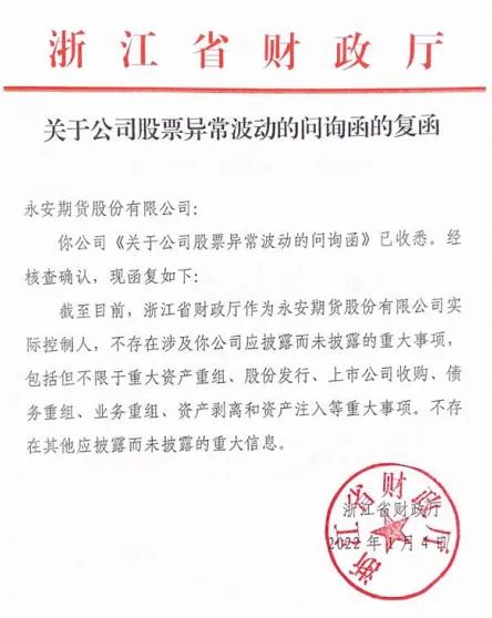 在最新公告中,永安期货还展示了浙江省财政厅关于公司股票异常波动的问询函的复函。浙江省财政厅表示,作为永安期货股份有限公司实际控制人,不存在涉及该公司应披露而未披露的重大事项,包括但不限于重大资产重组、股份发行、上市公司收购、债务重组、业务重组、资产剥离和资产注入等重大事项,不存在其他应披露而未披露的重大信息。