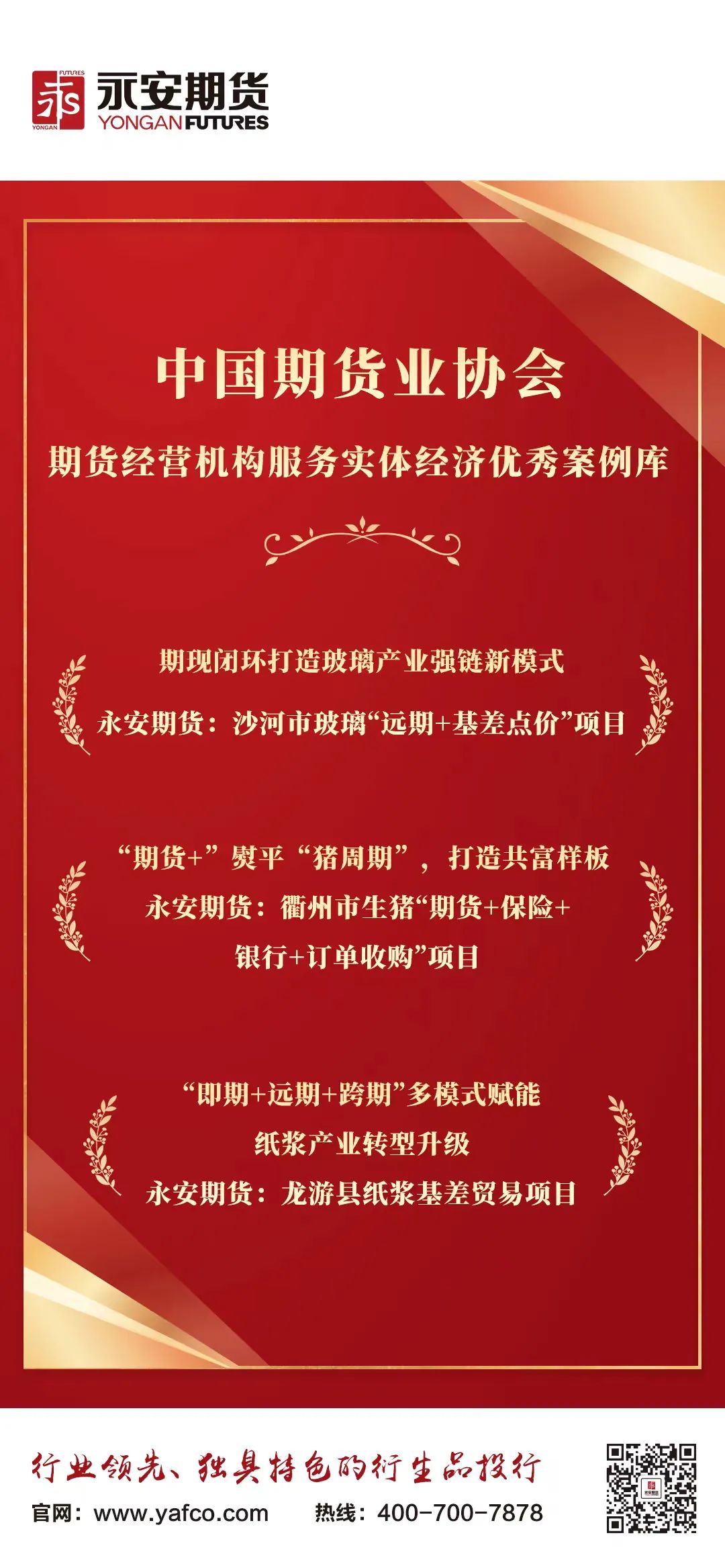 5月12日,中国期货业协会正式公布“2022年度期货经营机构服务实体经济优秀案例”名单,永安期货沙河市玻璃“远期+基差点价”项目、衢州市生猪“期货+保险+银行+订单收购”项目、龙游县纸浆基差贸易项目成功入围优秀案例库,为入围案例最多的期货公司之一。