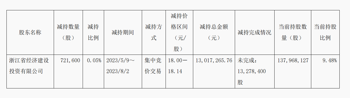 公告显示,永安期货于2023年4月12日披露了《永安期货股份有限公司5%以上股东集中竞价减持股份计划公告》,公司5%以上股东浙经建投因自身经营需要,计划通过集中竞价方式减持不超过1400万股,即减持比例不超过公司总股本的0.96%。