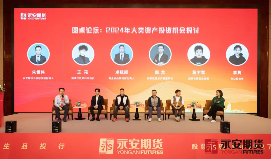 永安期货北京研究院副院长朱世伟主持圆桌论坛,德康农牧王菘、高金食品卓毓超、凯普乐资管周龙、魔寓私募蒋宇莺以及专业投资者李隽就2024年大类资产投资机会进行研讨。