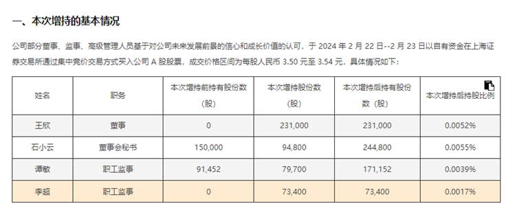 同期,董事会秘书石小云增持了9.48万股,成交金额约33.18万元~33.56万元;职工监事谭敏增持了7.97万股,成交金额约27.9万元~28.21万元;职工监事李超增持了7.34万股,成交金额约25.69万元~25.98万元。