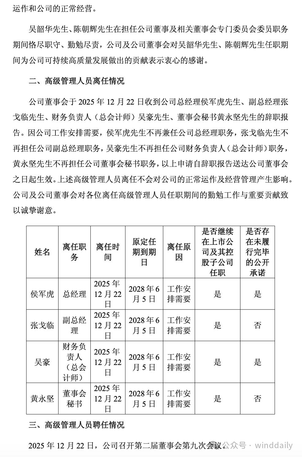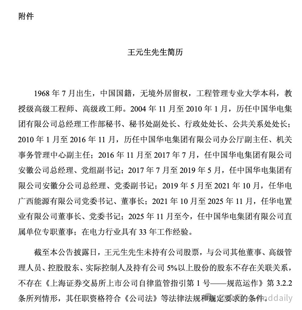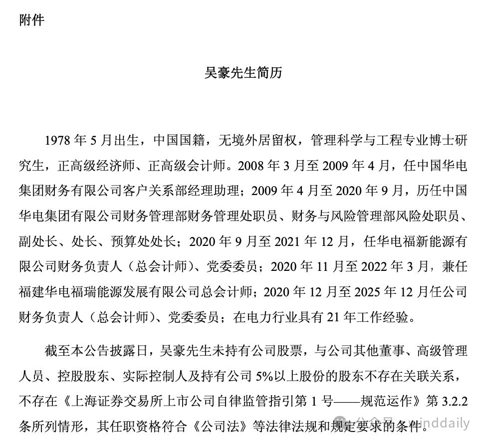 华电集团旗下华电新能今日官宣人事大变动:董事长侯军虎不再兼任总经理,原财务负责人(总会计师)吴豪接任总经理,并获提名为董事候选人;张戈临不再任副总经理,黄永坚不再任董秘;聘任杨帅为董秘并兼任财务负责人(总会计师);吴韶华、陈朝辉辞去董事及相关专委会职务,辞职后不再任职。75后吴豪从财务负责人直接晋升为总经理,在央国企属破格提拔、极为罕见。详情如下: