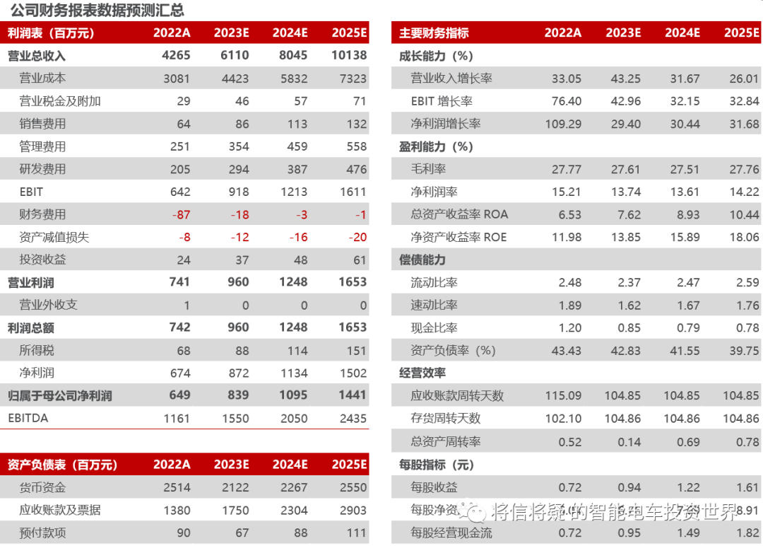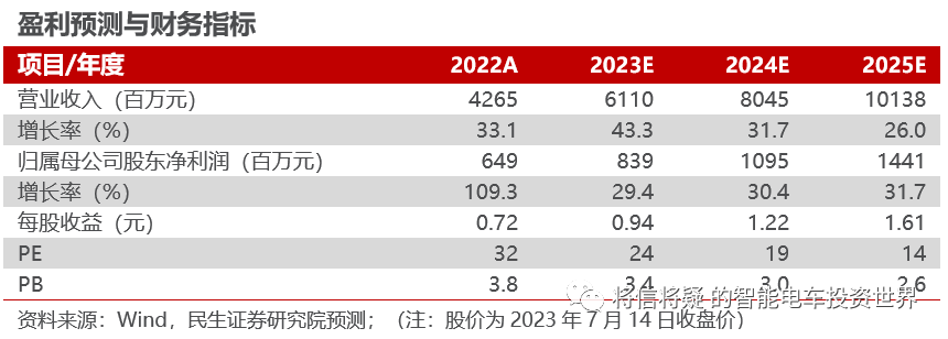 ?投资建议:公司客户资源优质,电动智能化加速转型,我们上调公司盈利预测,预计公司2023-2025年实现营收61.10/80.45/101.38亿元,实现归母净利润8.39/10.95/14.41亿元,当前市值对应2023-2025年PE为24/19/14倍,维持“推荐”评级。