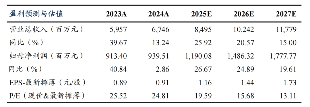我们维持对公司2025-2027年归母净利润分别为11.90亿元、14.86亿元、17.78亿元的预测,当前市值对应市盈率分别为20倍、16倍、13倍,我们维持对公司“买入”的评级。
