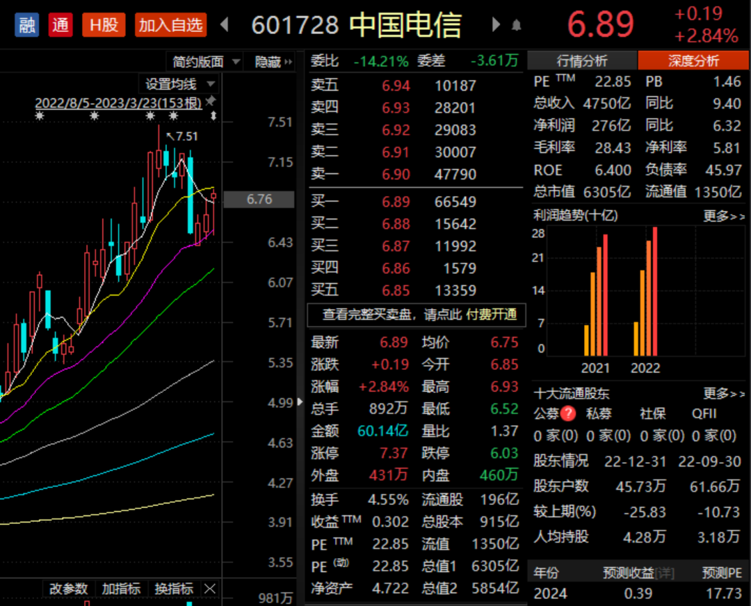 此前,中国电信也表示,公司高度重视股东回报,积极履行利润分配承诺,自2022年起宣派中期股息,并将在A股发行上市后三年内,逐步将每年以现金方式分配的利润提升至当年本公司股东应占利润的70%以上,不断为广大股东创造价值。