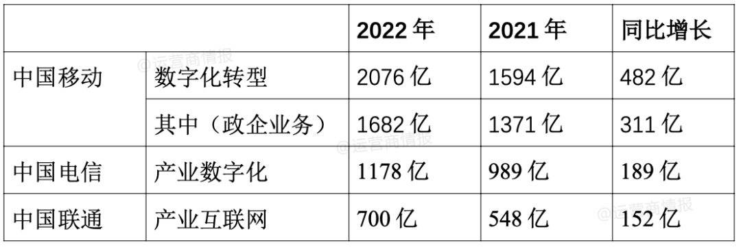 中国移动(数字化转型)、中国电信(产业数字化)、中国联通(产业互联网)数据对比: