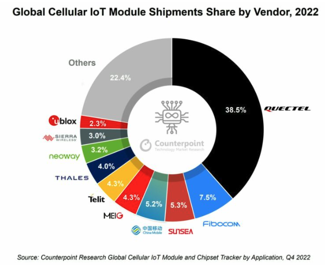 Counterpoint高级研究分析师 Soumen Mandal指出,移远通信是最大的蜂窝物联网模组制造商。同时,中国移动和广和通凭借其在国内市场的巨大规模,分别位居第二和第三。在中国以外,移远通信仍然是领导者,Telit和Thales紧随其后,这两家公司已经合并成立新品牌Telit Cinterion,并从2023年第一季度开始运营。