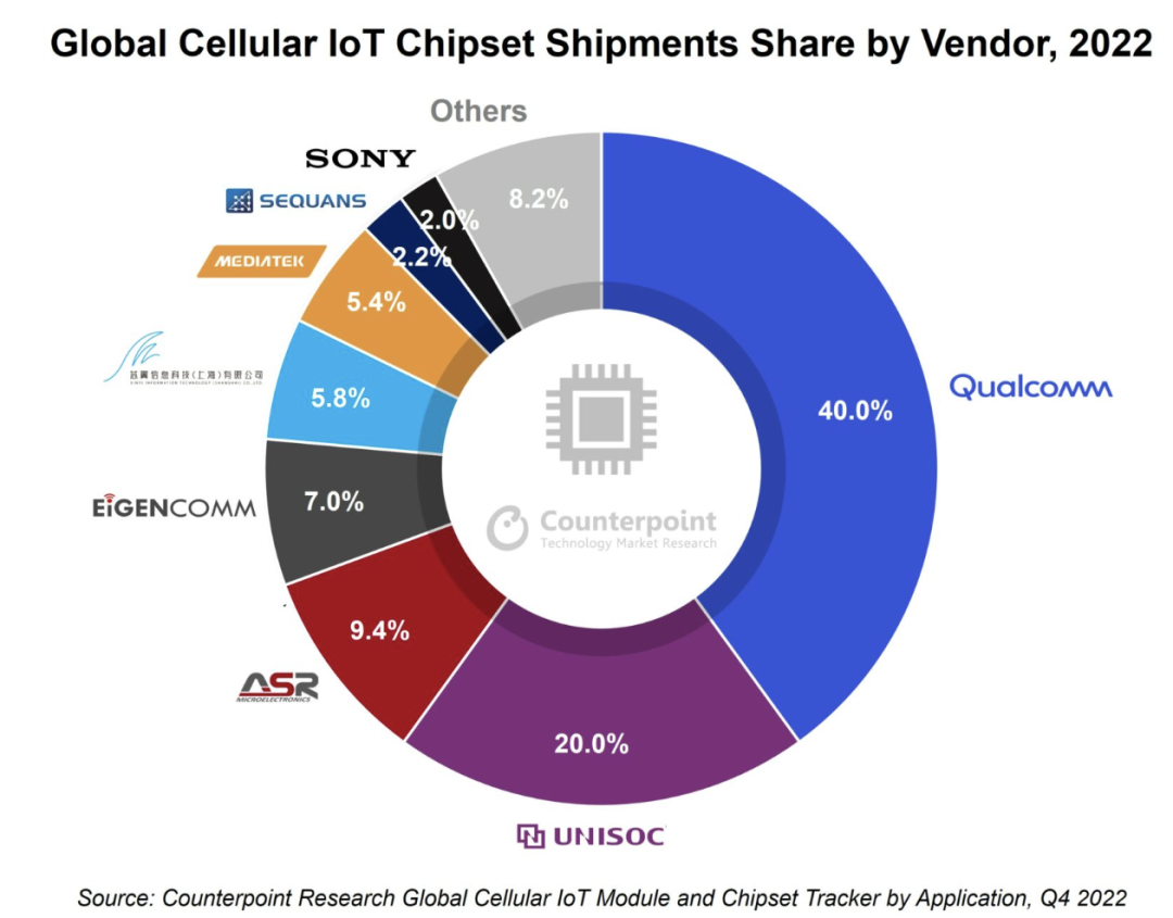 从蜂窝物联网通信连接芯片厂商看,高通在2022年继续主导蜂窝物联网芯片市场,出货量份额接近40%。Counterpoint副总监Ethan Qi指出,高通巩固在LTE CAT 4等更高速率技术领域的地位,并维持在5G市场的主导地位。高通近期推出最新的4G CAT1.bis芯片QCX216,与LTE CAT1.bis领军企业紫光展锐(UNISOC)和上海移芯通信科技(Eigencomm)正面竞争。