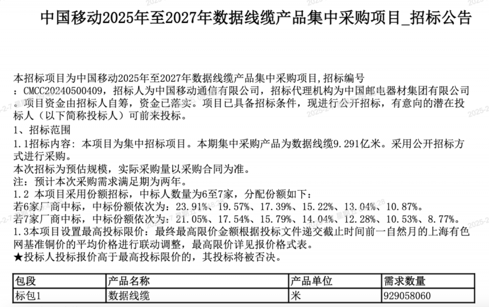 2月7日消息(九九)中国移动采购与招标网日前发布2025年至2027年数据线缆产品集中采购项目招标公告,该项目集中采购产品为数据线缆9.29亿米。预计本次采购需求满足期为两年。