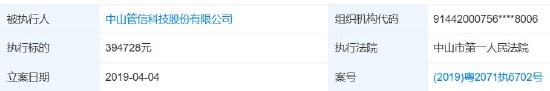 《5D调查》注意到,2019年04月04日,该公司曾被中山市第一人民法院列为被执行人,执行标的为394728元。此外,早在2012年07月25日,该公司因擅自挖掘城市道路案被中山市西区城管进行行政处罚。