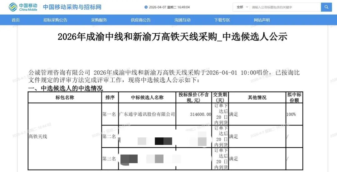 近日,中国移动关于成渝中线和新渝万高铁天线采购项目发布中选候选人公示,广东通宇通讯股份有限公司以第一名成绩成功中选。此次中标是通宇通讯在轨道交通通信领域取得的又一重要成果,充分体现了公司在高铁天线产品方面的综合竞争力。