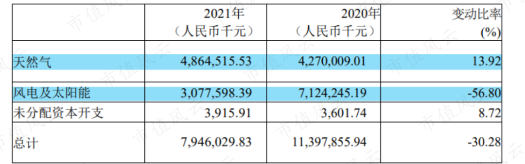 另外,伴随2020年底陆上风电补贴停止,公司2021年的风电投资腰斩,降幅57%。