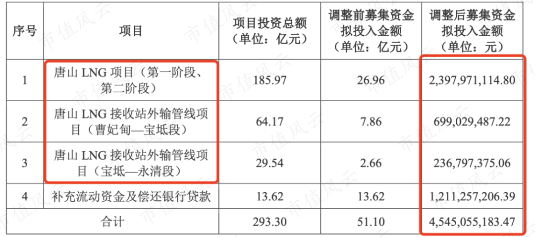 以最大的募投项目唐山LNG(液化天然气)为例,投入24亿,撬动的项目总投资高达186亿,预计在2022年及2025年分两阶段建成,主要包含LNG储罐和LNG船舶接卸泊位。