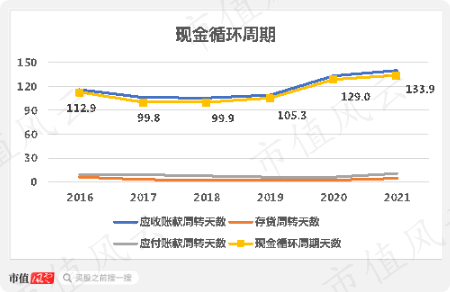 公司现金循环周期较长,2021年为133天,说明公司现行的商业模式下资金占用是比较高的,但是近年来变化不大。