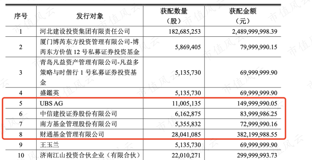 在这次特定投资者名单中,控股股东最终认购24.9亿,占总发行募资的54%。此外,本次募投的最终认购名单里也不乏有瑞银集团、中信建投、南方基金等资金方。