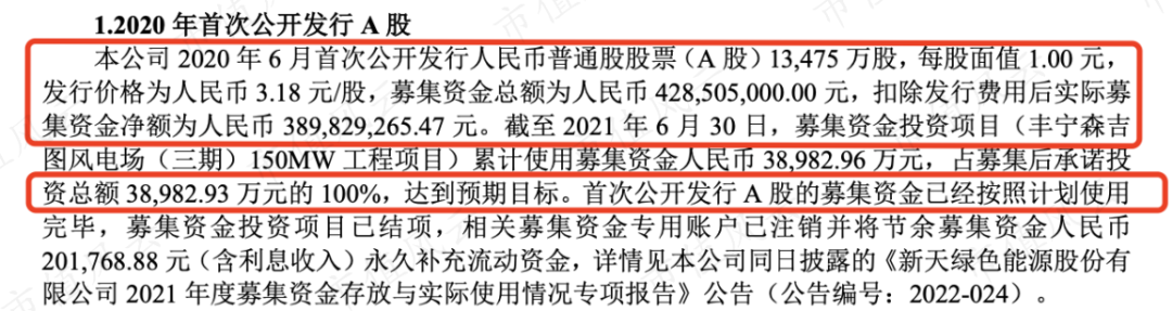 公司回归A股上市募资约3.9亿,全部用于丰宁森吉图风电场(三期)150MW工程项目的投资,总投资额高达14.7亿。