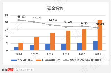 公司分红并不小气,近六年分红现金占归母净利润一直处于30%以上。从2016年至2021年,公司归母净利润总计78.3亿,累计分红27.8亿,总分红占比为35.5%。