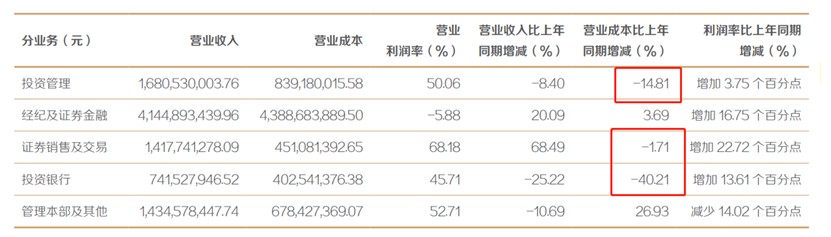公司其他业务板块方面,除了“经纪及证券金融”业务营业成本同比微增3.69%,投资管理、证券销售及交易、投资银行三项主要业务的营业成本同比分别减少14.81%、1.71%、40.21%。