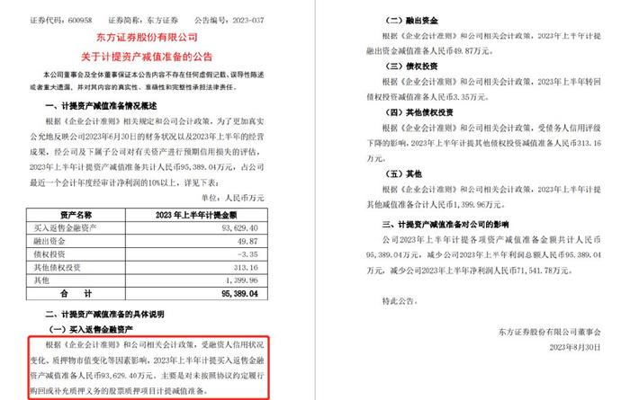 这也难怪,东方证券近期发布了计提减值公告——2023年上半年计提各项资产减值准备金额共计9.54亿元,其中9.36亿元与股质业务相关;减少2023年上半年净利润7.15亿元。