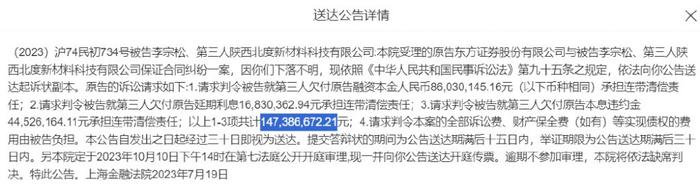 行家发现上海金融法院也发布了类似的公告,拟于今年10月10日审理东方证券诉李宗松、陕西北度新材料科技有限公司(简称:陕西北度)相关保证合同纠纷案。同样因为当事人下落不明,以公告方式送达。顺便一提,这起本金0.86亿元的案件,连同利息和违约金,东方证券的诉讼主张高达1.47亿元。