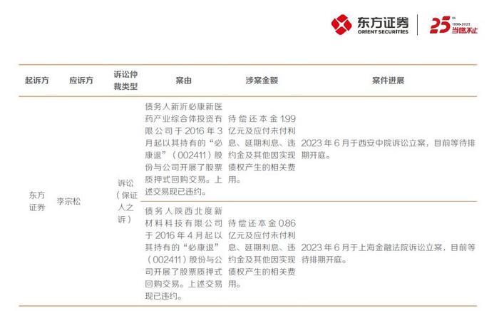 东方证券表示,债务人新沂必康于2016年3月起以其持有的“必康退”(002411)股份与公司开展了股票质押式回购交易。上述交易现已违约,待偿还本金1.99亿元。2023年6月,于西安中院诉讼立案,等待排期开庭。债务人陕西北度于2016年4月起以其持有的“必康退”(002411)股份与公司开展了股票质押式回购交易。上述交易现已违约,待偿还本金0.86亿元。2023年6月于上海金融法院诉讼立案,目前等待排期开庭。