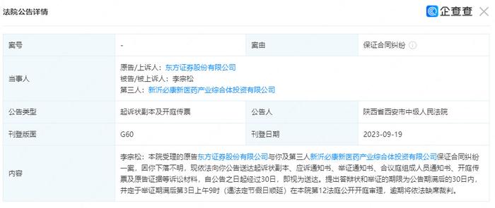 公告显示,本案系西安中院受理的原告东方证券股份有限公司(简称:东方证券)与被告方李宗松及第三人新沂必康新医药产业综合体投资有限公司(简称:新沂必康)保证合同纠纷一案。因被告方下落不明,西安中院依法公告送达起诉状副本、应诉通知书、举证通知书、合议庭组成人员通知书、开庭传票及原告证据等诉讼材料,自公告之日起经过30日,即视为送达。