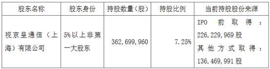 截至公告披露日,视京呈通信共计持有江苏有线3.63亿股无限售条件流通股,占公司总股本比例为7.25%。其中IPO前取得2.26亿股,其他方式取得1.36亿股。