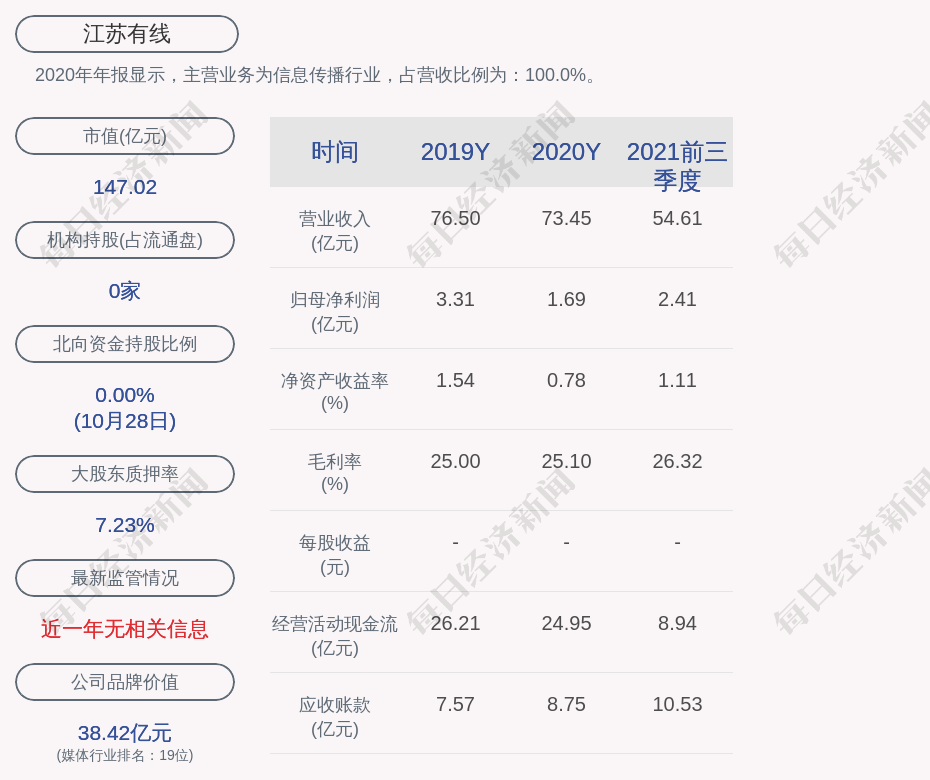 2020年年报显示,江苏有线的主营业务为信息传播行业,占营收比例为:100.0%。