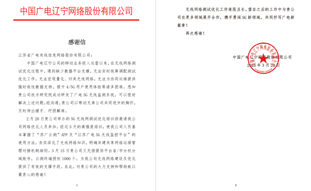 3月23日,中国广电辽宁网络股份有限公司向江苏有线发来感谢信,感谢公司提供的广电5G无线监测系统及“苏广云测”APP,对辽宁省广电5G无线网络测试及优化的支持和帮助。