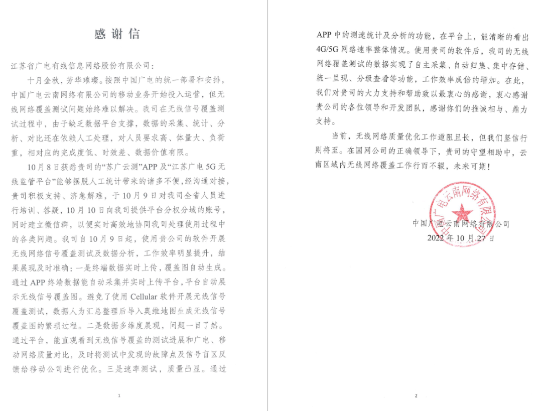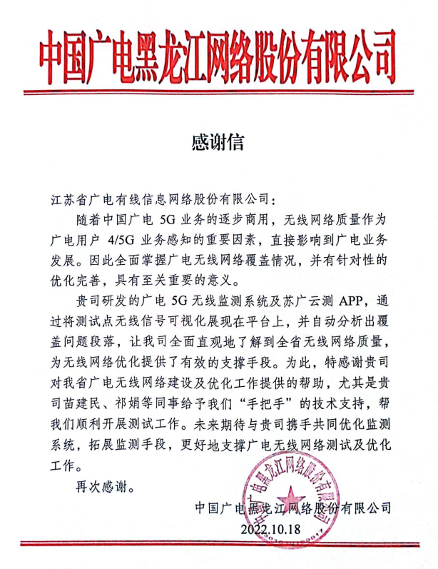 在此之前,公司因提供广电5G无线监测系统服务支撑,已分别收到来自中国广电云南网络有限公司以及中国广电黑龙江网络股份有限公司两封感谢信。
