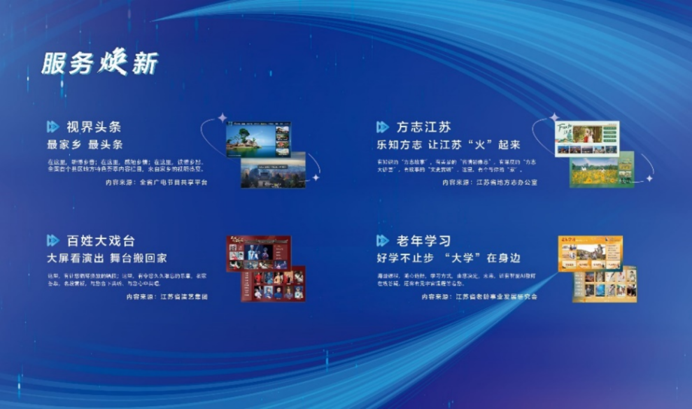 公司认真学习贯彻习近平文化思想,立足“党媒政网民屏”属性定位,精准对接人民群众新需求新期待,全力实现“两效统一”。公司以不断满足人民群众日益增长的精神文化需求为主责,推动公共文化服务体系标准化、均等化建设,不断提高偏远、落后地区的广电网络有效覆盖,连续多年实施“农村低保看电视”民生实事项目。加快推动内容创优提质建设,不断提升文化产品供给质量与服务能力,基础免费点播节目量从2万小时增至4.5万小时。重点打造广电独家“特色内容矩阵”,先后上线“视界头条”“老年学习”等特色专栏,全面弘扬主流旋律,持续丰富公共服务。公司以传承中华优秀文化为使命,上线“南京非遗”“方志江苏”“百姓大戏台”等专栏,承办了全国首个长江文化数字大展“何以长江”,VR展馆大小屏同步上线,累计传播量2亿。公司以助力乡村振兴为己任,持续发力“智慧广电乡村工程”民生实事项目,截至2023年底已建成694个智慧广电乡镇(街道),服务乡村家庭600多万户,受益人群近1700万。积极探索数字化赋能新时代文明实践中心(所、站)建设,巩固乡村舆论宣传阵地。每年积极参加全省文化科技卫生“三下乡”文明实践活动,将群众需要的文化服务送到基层一线,进一步丰富群众精神文化生活。
