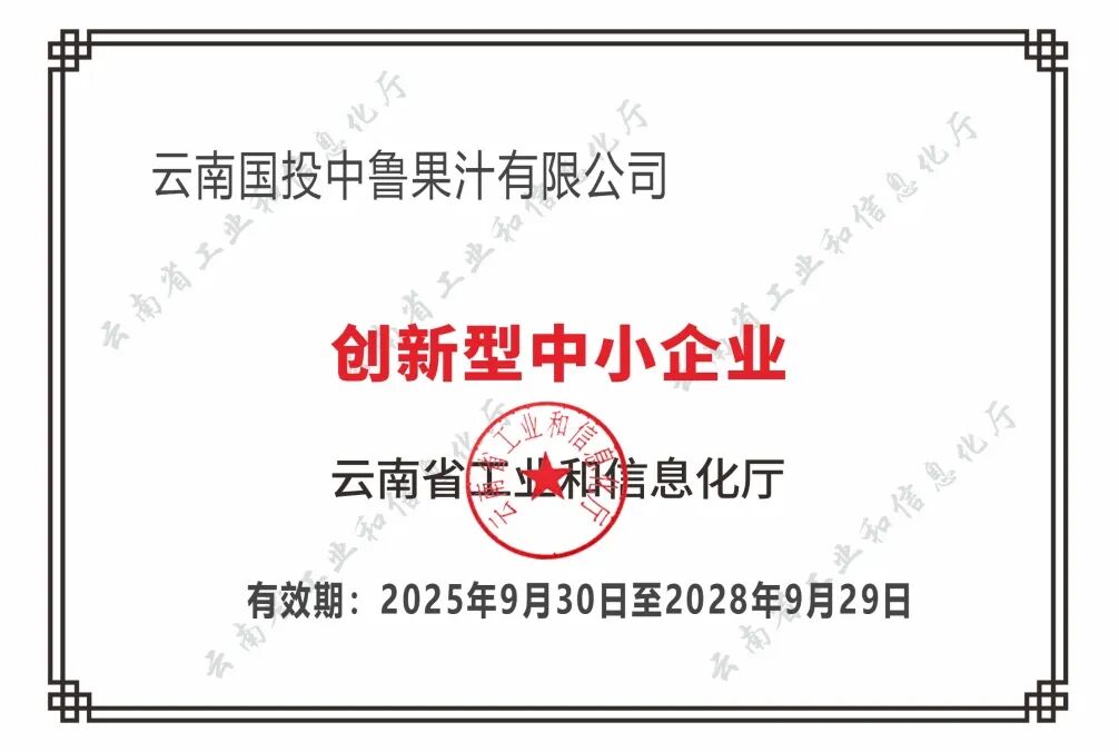 近日,云南省工业和信息化厅正式公布2025年度云南省创新型中小企业认定名单,国投中鲁控股企业云南国投中鲁果汁有限公司(以下简称云南中鲁)凭借在创新能力、专业化发展、成长性等维度的突出表现成功入选。