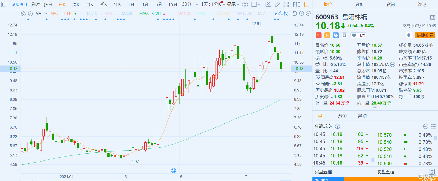 格隆汇7月19日丨岳阳林纸(600963.SH)跌逾5%,报10.18元,暂录四连跌,期间累计跌幅逾13%,最新总市值184亿元。岳阳林纸上周五盘后公告,公司收到湖南证监局《行政监管措施决定书》,涉及控股股东违规占用资金等事项。对岳阳林纸和控股股东泰格林纸采取出具警示函措施决定,对叶蒙、李战、钟秋生、易兰锴采取监管谈话措施决定。