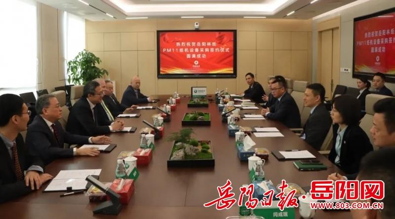2月21日,中国纸业投资有限公司旗下最大的文化纸生产基地—岳阳林纸股份有限公司与维美德技术有限公司签订45万吨项目PM11纸机设备采购合同。中国诚通党委委员、副总经理童来明出席签约仪式。中国纸业党委、董事会负责人、总经理钟天崎,中国纸业党委副书记竺小政、纪委书记南红平,岳阳林纸党委书记、董事长叶蒙,维美德运营副总裁Kari Humalajoki、销售副总裁范泽等参加签约仪式。岳阳林纸总经理李战、维美德中国区总裁朱向东分别代表双方签约。岳阳林纸副总经理尤昌善主持仪式。